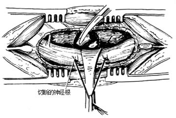 ⑺结扎、切断神经根,牵开脊髓(胸段),清除硬脊膜前病灶