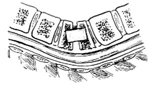 2.显露、清除椎体病灶 如取经胸途径,可参阅经胸结核病灶清除术的手术步骤。如取后侧途径,切口同“经肋骨、横突切除结核病灶清除术”。唯应靠近后正中线作纵行或作弧形切口,以备术中需要时可扩大显露、切除关节突及椎板[图1