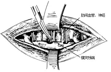 ⑴]。切口长度超过病椎上、下各两个椎体。必要时可切断骶棘肌以充分显露。一般先切除两条后段肋骨与横突,如病变广泛,可切除3~4条。在肋条下缘分离出肋间神经[图1