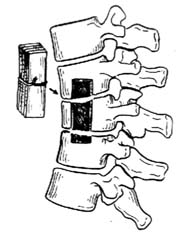 4.椎体间植骨 如病灶清除彻底,椎体间有缺损存在;或脊柱稳定性不佳,而病人全身情况良好,病灶又无混合感染时,可用椎体牵开器将两端椎体牵开,施行椎体间植骨充填缺损,以预防和矫正部分后突畸形,促进病变愈合,加强脊柱稳定,可免除第2次融合手术。用骨凿在2个或以上病椎的侧方凿宽、深均约1~1.5cm的骨槽,上、下端必须达正常骨质。骨槽内如有椎间盘及软骨组织应予切除。将取下的正常肋骨纵行剖成两半,截成比骨槽长度稍长的骨段,重叠一起,用肠线捆住植入骨槽。也可以从髂骨取一相应大小的骨块植入。植入时,术者也可用手顶住后突椎体,助手将躯干两头慢慢向后推压,扩大病椎间隙,然后将骨嵌入骨槽。当去外力后,植骨即被紧紧夹在椎间,不致术后发生植骨移位[图1