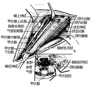 ⑶向外拉开颈动脉鞘,向内拉开甲状腺、气管、食管,显露椎前筋膜及术侧颈长肌