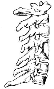 4.椎体间植骨 彻底冲洗病区及止血后,对病灶清除彻底、有椎体缺损的病例宜同时进行椎体间植骨术,以促进愈合、矫正或预防畸形。先将缺损区上、下椎体骨面修成新鲜骨面,再在前面凿一浅槽,根据缺损的大小及槽的长度,取相应的t形髂骨一块,轻轻牵引头部,使颈过伸,拉开颈椎间隙后,嵌入颈椎病区。然后,慢慢放松牵引,置颈部于中立位,移植骨即被紧紧嵌住于上、下承受骨之间。用t形骨块的两臂架在椎体前面的浅槽内,故植骨不会突入椎管而压迫脊髓。但骨块不能过多高于椎体前缘,以免妨碍吞咽[图3