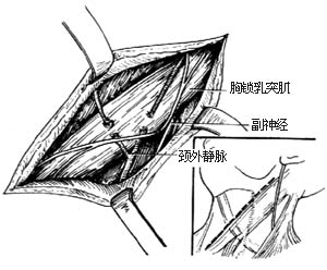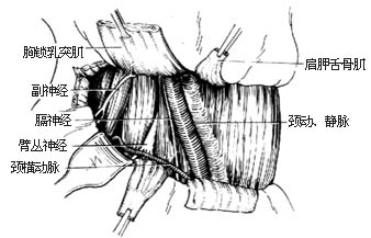 ⑶牵开(或切断)胸锁乳突肌和肩胛舌骨肌,显露颈动脉鞘