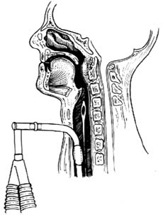 一般多选用经气管切开气管内麻醉,其优点是:①病人不会感到在术中长时间张口引起的不适;②不会有象表麻或局麻不完善引起的恶心、挣扎,妨碍手术进行;③可以防止脓液误入气管,引起吸入性肺炎或结核播散;④可以防止术后咽喉水肿引起呼吸困难。施行麻醉前,应先摆好手术体位,再于局麻下作颅骨牵引及气管切开术,然后经气管切开插入带气囊的气管导管,将气囊充气后即可进行气管内麻醉[图1]。
