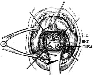 4.显露病椎 用止血钳探查脓腔,有时脓肿为哑铃型,于椎前筋膜上可见一小孔,经孔切开椎前筋膜,用4根丝线缝过椎前筋膜两侧缘向两侧拉开,即可显露病椎[见2
