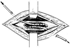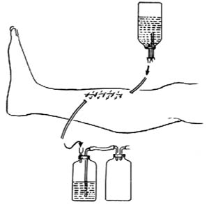 1.如系关节内灌洗,先切开关节囊,吸尽脓液或积液,清除所有纤维素、坏死组织,同时取脓液作细菌培养及抗生素敏感试验。检查关节腔内病变情况和相应处理后,用大量盐水彻底冲洗。安放灌洗和引流管时,灌洗管应放在关节腔低位,吸引管应放在高位,使关节腔始终充满抗生素液。严密缝合关节囊等各层,双管应分别经肌层穿孔在皮肤上戳口引出,并用丝线固定于皮缘上。