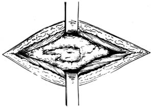 1.体位、切口 体位随切口而定。四肢手术用充气止血带。切口的设计,应根据x线片所显示死骨的位置,选择最直接的、对组织损伤小的途径。如沿窦道进入,一般均可到达病灶;若窦道位于重要神经、血管的周围,或距离病灶太远,则应考虑另选比较安全、直接的途径。