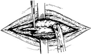 2.显露病灶 如计划沿窦道进入病灶,可先用探针了解窦道方向并以此作为引导。然后,根据需要长度切开皮肤,并切除窦道及瘢痕组织。再将软组织分离,直达骨面。切开骨膜,稍向两侧剥离(不可过广,以免影响骨血运),即可显露病灶[图1
