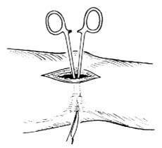 ⑴],切开筋膜和髌骨旁支持韧带,即可显露关节囊。后侧切口应处于肢体在仰卧时的低位,有利于引流,但容易自动闭合,且可引起小腿后部筋膜间隙感染,仅在必要时才加用后外侧或后内侧切口作为对口引流。如需作后外侧或后内侧切口,可用止血钳从前侧切口插入关节腔,从后外侧的股二头肌腱前缘突出,作为对口切开的指标,以免损伤腓总神经。后内侧切口需以同法自半腱肌、半膜肌之间切开[图1