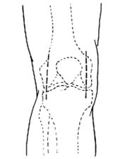 2.切口、显露 膝关节比较表浅,通常在髌骨两旁作前外侧及前内侧切口,自髌骨上极平面至胫骨结节平面[图1