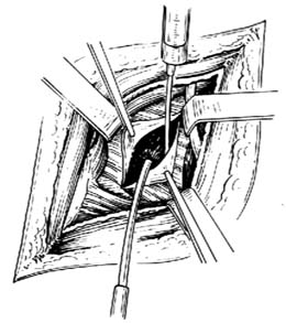 3.切开关节囊、清除脓液 关节囊在被脓液胀满时容易辨认,外观膨隆,触之有张力感。穿刺证实后即可沿股骨颈纵轴作全长纵行切开或作十形切开,吸引涌出的脓液,关节囊内用大量盐水彻底冲洗,关节间隙可插入细导管注水冲洗[图1