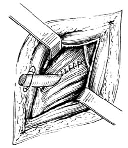 ⑷]。如滑膜炎症较重,可在关节内放2条细塑料管后缝合关节囊和切口,露在皮肤外面的塑料管应用无菌纱布保护,备术后冲洗、引流、注药用。关节破坏严重或脓液粘稠者,可作关节内引流,将香烟引流放在关节囊切开处,不缝关节囊,或直接将关节囊切开缘缝合于臀肌筋膜上,以利引流。缝合关节囊均用铬制肠线。