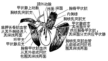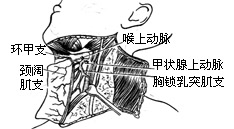 多数自甲状腺上动脉分出,少数直接出自颈外动脉分出。发出后沿胸锁乳突肌前缘内侧下行,然后逐步分成向后细支成网状包围于该肌的浅深两面与向前分支供应舌骨下肌群(图2)。