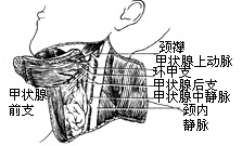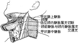 (3)下切缘:齐胸骨切迹切,颈前静脉残端尽可能留得长些以备万一需要与颈外或颈横静脉吻合,切胸骨舌骨肌及胸骨甲状肌时亦要尽可能低此支防颈襻分支入肌点较低而被误断。
