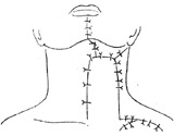 1987年5月起我科开始应用,除非颈供区缺损不到3-4cm或病人颈部松弛很容易直接拉拢缝合,我们一律用此法,横形设计在病侧锁骨水平,蒂在中线,宽约4.5-5cm,瓣长9-13cm,外侧达胸大肌与三角肌相交处。上一横切口相当于锁骨上缘,即颈清扫的下切口。下横切口与之平行。分离皮瓣时从外侧开始向内铡分离,一定要将胸大肌筋膜包括在皮瓣侧,宁可伤及胸大肌而不伤上述筋膜,到达内侧时要防止伤及胸廓内动脉穿支。一般蒂能分到中线的。筋膜皮瓣移转后,在胸部切口周围作皮瓣下游离,然后将其向锁骨上缘拉,用中线缝合于锁骨骨膜即可消失胸部供区创面(图12)。