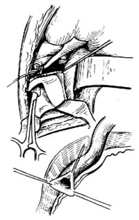 静脉吻合的部位较深,故需先做。在髂静脉选定的部位上,按照肾静脉切端的口径,切除大小相仿的椭圆形一小块髂静脉壁。作肾静脉与髂静脉的端侧吻合。先在吻合口的两角用4-0单根尼龙线各缝一针,结扎、固定吻合口的后壁在静脉腔内作连续缝合,前壁在血管外面缝合,线线打在外面[图1-6]。静脉吻合完毕,肾静脉上可夹一把blalock钳而去除夹在髂静脉上的satinski钳,以恢复来自下肢的静脉回流。