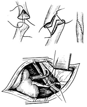 ⑴输尿管植入膀胱或输尿管膀胱吻合术:此种方法具有抗尿液逆流的作用。方法是在膀胱近底部切开,并在右侧输尿管开口的外上方大约4~5cm处,用一止血钳在膀胱侧壁肌肉层戳一小孔,从这点用一弯血管钳向正常输尿管方向作3~4cm长的粘膜下隧道。在隧道的下端切开粘膜。由膀胱壁上小孔再沿此粘膜下隧道将输尿管拉入膀胱内。把多余的输尿管切去,将输尿管断面的一侧纵形剪开以扩大新的开口。然后用肠线将输尿管末端与膀胱粘膜间断缝合。在输尿管进入膀胱处,再间断缝合固定几针以加强吻合口。注意勿使输尿管扭转。膀胱壁的开口和粘膜下隧道要宽松一些,以免输尿管下端被缩窄。膀胱分两层或三层缝合,并作留置导尿[图1-8]。