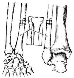 图3 用腓骨上端移植,修复桡骨或腓骨下端的缺损