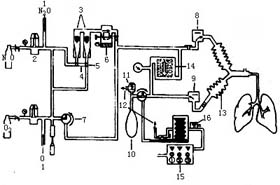 将新鲜气体(包括麻醉药)输送至病人,并将病人呼出气体输出。根据呼出气体是否有复吸入而健为无复吸入和复吸入系统。