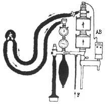 (1)呼出气体通过co2吸收器后,部分或全部被病人再重复吸入。可分为来回式及循环式两种(图7、8,图中f为新鲜气流,ab为co2吸收器,a为呼气活瓣)。