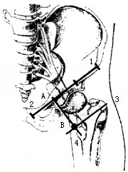 ②从髂前上嵴到耻骨结节划一连线;再经股骨大转子划一与连线的平等线。