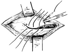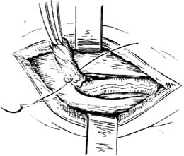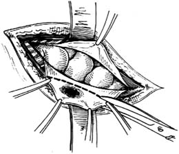 1.切口 此种手术的切口应比经腹股沟途径的切口稍高。在病侧腹股沟管内环上方约0.5cm处(相当于病侧下腹部自然皱襞平面)作一长约3cm的横切口;切口的内侧端起于病侧腹直肌外缘。切开皮肤和浅筋膜后,按切口大小切开腹外斜肌腱膜[图2-1]。再顺肌纤维方向切开腹内斜肌,并将其钝性分离,向上下拉开。然后沿皮肤切口横向切开腹横肌和腹膜,进入腹腔。注意避开髂腹下神经和腹壁下血管。