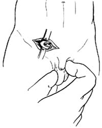 2.显露疝囊口 用蚊式止血钳提起切口下缘的腹膜向下牵拉后,即可见内环处的疝囊口[图2-2]。伸入小指检查疝囊内情况。