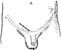 1.体位、切口 仰卧位。自腹股沟韧带中点上方3cm处至耻骨结节,作与腹股沟韧带平行的斜切口,长约6cm[图3-1]。