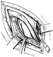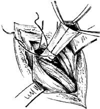 手术开始步骤同精索原位腹股沟斜疝修复术。在修复时,先拉开精索,将内环处的腹横筋膜缺损间断缝合。然后在腹直肌前鞘纵行切开,减少缝合的张力[图5-2]。用左手示指触及股静脉加以保护,再用4号或7号丝线间断缝合联合肌腱和耻骨韧带3~4针[图5-3]。将精索置于腹内斜肌外面,重叠缝合腹外斜肌腱膜后,依次缝合皮下组织和皮肤。