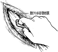 用小止血钳夹住并提起腹外斜肌腱膜的两缘,用缠以纱布的示指在腱膜切缘深面向两侧分离。下外侧缘需分离到腹股沟韧带,上内侧需分离出腹内斜肌、腹横肌游离缘和联合肌腱[图3-5]。分离过程中,注意不应损伤腹外斜肌腱膜深面的髂腹下神经和髂腹股沟神经。