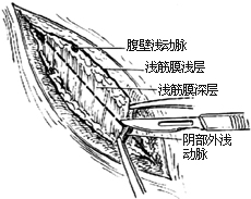 2.显露疝囊 切开皮肤后,最先遇到的是浅筋膜浅层(即皮下脂肪)。切开此层时,可在术野见到两条腹壁浅部动脉(即切口外段的腹壁浅动脉和切口内段的阴部外浅动脉),应一一结扎、切断,防止不必要的出血,再顺切口方向切开浅筋膜深层[图3-2]。