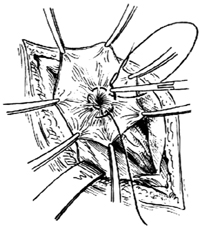如果疝囊较小,可在颈部缝扎、切断[图3-9];如果疝囊较大,则可将疝囊游离缘提起,并将疝囊颈尽量拉出。在颈部高位用4号丝线作荷包缝合[图3-10]。扎紧荷包缝线后,再行缝扎加固,使局部腹膜不再存在袋形突出。然后在缝线远端1cm处切除疝囊。缝合时必须注意避免损伤精索和腹壁下血管,还应避免扎住腹腔内脏器。如疝囊较大,可不分离疝囊下半段,只在其中部切断后切除上半段,保留下半段,以减少组织损伤和出血。最后将疝囊残端推回腹膜外间隙。