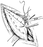 其次,将提睾肌切开缘作间断缝合后,用4号或7号丝线从上方开始将联合肌腱间断缝于腹股沟韧带上,针距1cm左右。待全部缝好后,自上向下依次将线打结[图3-12]。腹股沟韧带上的针孔要浅而宽,以防损伤股动、静脉。几个针孔不要缝在同一纤维束间,以防拉紧后撕裂,影响修复后强度。缝合时还要注意避免张力过大,影响愈合。