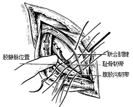 ⑴]。mcvay根据尸体解剖证明:联合肌腱和腹横筋膜的止点不在腹股沟韧带,而在耻骨韧带,故修复时宜将联合肌腱缝于耻骨韧带上。这样做的结果,可使疝的复发率降低,修复后发生股疝的机会也少。但耻骨韧带距股静脉较近,操作比较困难。