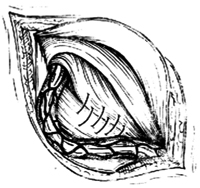 修复时,拉开精索,用细丝线间断缝合内环处腹横筋膜的缺损后,再用4-0或7-0号丝线将联合肌腱缝在腹股沟韧带上,最上一针不能缝得太紧,以免压迫精索[图6-1]。然后将精索置于腹外斜肌腱膜外面,再将腹外斜肌腱膜重叠缝合[图6-2]。有时在精索自内环通出处尚需将腹外斜肌腱膜切口上端另切一横行小口,切断部分纤维,使精索不致受压。最后将精索置于皮下层,间断缝合皮下组织和皮肤。