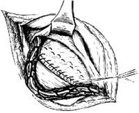 最后,把联合肌腱和腹横肌腱膜(弓),缝合到腹股沟韧带上,以增强腹股沟管后壁[图7-4]。精索置于腹外斜肌腱膜下,缝合该腱膜[图7-5]。