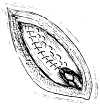 5.缝合 仔细止血,必要时用温盐水纱布敷压创面,小出血点均应一一结扎;然后冲洗伤口,用细丝线间断缝合浅筋膜深层和皮肤。一般情况下不需引流。