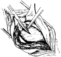 仔细分离精索,注意其周围的组织,在精索的内上方寻找疝囊。有困难时,可嘱病人用力咳嗽或收缩腹肌,使疝囊外突。辨清疝囊后,即可提起、切开[图3-7]。