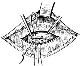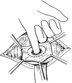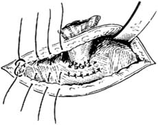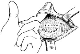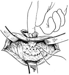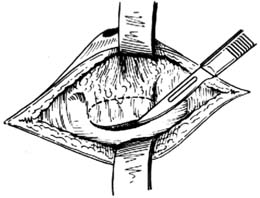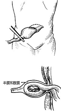 小的疝囊无粘连,分离切开常无困难;但大的疝囊病史久,常与内脏有粘连,在分离、切开疝囊时,要注意避免损伤疝内容物。如果在疝囊远端切开时,因粘连不能进入腹腔,可将疝囊提起,分离出腹直肌前鞘和疝囊颈的交界处(该处多无粘连),然后在此处切开疝囊,用小指伸入探查,推开粘连。如为肠管,可推回腹腔;如为大网膜,可与疝囊一并切除。