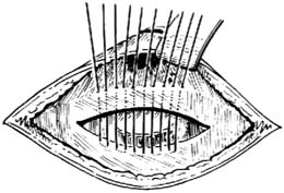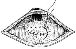 待筋膜修复完毕后,先用示指将皮肤切口上瓣的脐孔撑开,松解周围的粘连[图2-6],再用另手示指敷以纱布将脐孔下压。然后,将脐孔部位的皮下组织缝合固定在中线的筋膜面[图2-7],最好将浅筋膜也固定在深面的筋膜和腹直肌前鞘上[图2-8]。最后,间断缝合皮下组织和皮肤。对较大的分离创面,应于皮下和筋膜上之间放置香烟引流。