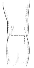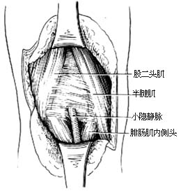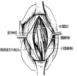 3.切口、显露 腘窝处作一横切口,将其外侧端向上,内侧端向下延伸。也可用中线纵行切口。拉开上、下皮瓣,显露肌肉和深筋膜。切开深筋膜,用圆头剪开细致分离后向两侧拉开。再把内侧肌肉拉开,充分显露胫神经和腘静脉[图1
