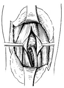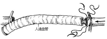 ⑴选一合适的人造血管,其直径最小要8mm。如动脉小于6mm,或其远段血运不佳者,应改用大隐静脉移植。腘动脉远端可剪成斜形,以便与较大的人造血管吻合。