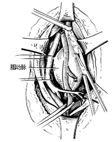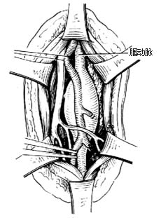 5.控制腘动脉 腘动脉近端常扩大弯曲,位于切口深部稍偏内侧,细致分离后,绕一纱布带以备加用血管夹[图1