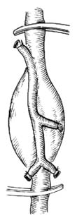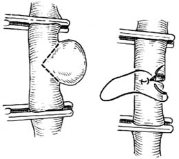 对于小型动脉瘤,切除瘤囊后可直接缝合修复管壁[图2];或作楔形切除横行修复[图3]。只要部分动脉壁尚健全,均可进行修复。