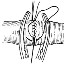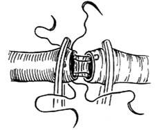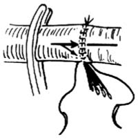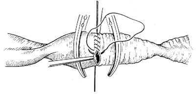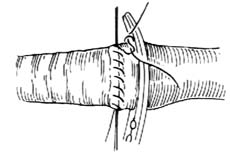 ⑵先从动脉近端开始吻合。安置两侧的外翻褥式定点缝合,结扎后按二定点吻合法作前、后壁连续缝合[图1
