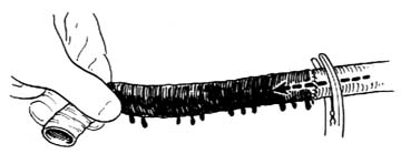 ⑶近端吻合完毕后,用手指夹紧人造血管的末端,暂时稍稍松开动脉端的血管夹,使血液充满人造血管,随即再关闭血管夹[图1
