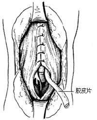 8.缝合切口 缝合切口之前,检查伤口内及伤侧足部的脉搏的颜色。观察膝部屈曲时,移植血管的情况。彻底止血后,用胶皮片放在腘窝内引流,仔细缝合筋膜[图1