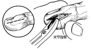 未及时治疗的脓性指头炎,已并发手指末节指骨慢性骨髓炎者,可出现死骨,使脓性指头炎经久不愈。对此可采用手指末节侧切口,显露指骨,摘除死骨;或用小咬骨钳咬除其末端的骨髓炎病骨。伤口用凡士林纱布条或胶皮片引流[图2]。