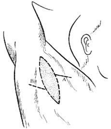 2.切口 将有毛区皮肤、皮下组织及汗腺作梭形切除,彻底止血。再于切口两侧分别作两个侧切口,形成a、b两个三角瓣,其顶角各约60°。