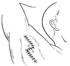 2.切口 于腋窝部有毛区作s形切开上半部皮瓣,用锐利的组织剪或尖刃刀切除大部分真皮层,将全部汗腺及毛囊切除,只留下薄中厚皮片。用同样的方法处理s形的下半部皮瓣。至此,腋窝部大部分真皮层和汗腺已被切除。